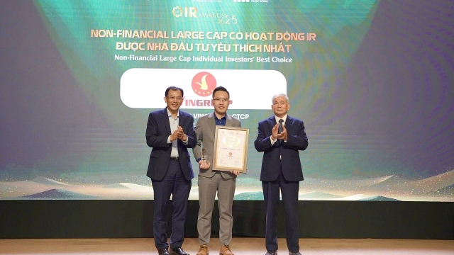 02/10/2025 17:58:44Tập đoàn Vingroup được vinh danh trong Top 3 Doanh nghiệp niêm yết vốn hóa lớn, phi tài chính (Non-Financial Large Cap) có hoạt động Quan hệ Nhà đầu tư (IR) được yêu thích nhất năm 2025, trong khuôn khổ chương trình IR Awards 2025. Giải thưởng không chỉ ghi nhận sự nỗ lực của Vingroup trong suốt quá trình xây dựng hệ thống IR chuyên nghiệp, mà còn là tín hiệu tích cực cho thấy niềm tin và sự gắn bó ngày càng lớn của nhà đầu tư đối với định hướng phát triển dài hạn của Tập đoàn.