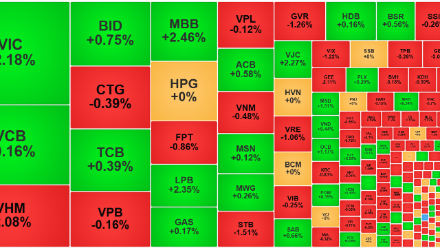 03/10/2025 16:20:58Mức điều chỉnh nhẹ 0,42% của VN-Index phiên cuối tuần vẫn chỉ là “lớp trang trí” cho giao dịch ở cổ phiếu: Tới gần 160 cổ phiếu giảm giá quá 1% (43% tổng số cổ phiếu có giao dịch), trong khi số mã đỏ nhiều gấp 2,7 lần số mã xanh…Thị trường tiếp tục gây ức chế cho nhà đầu tư khi mức thiệt hại của danh mục gia tăng từng ngày, dù chỉ số đại diện thị trường lại như “ru ngủ”. VIC tăng 3,22%, VHM tăng 1,42% đã đem về 4,8 điểm cho VN-Index.